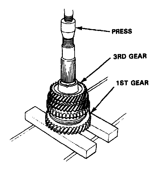 4. Support 1st gear on steel blocks as shown and press the shaft out of 3rd gear.