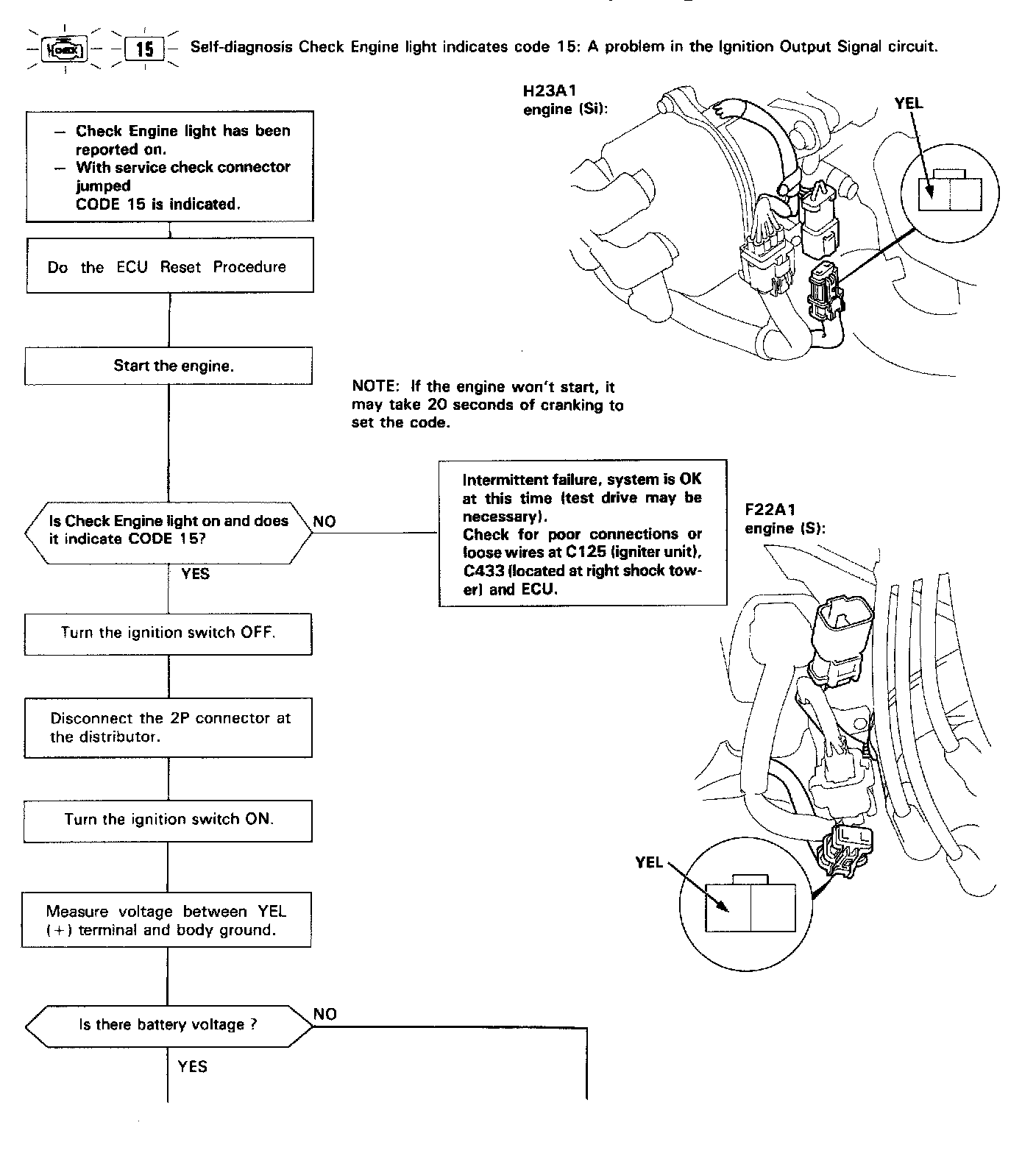 Check Engine Light blinks fifteen times:Most likely a problem in the Ignition Output Signal Circuit.