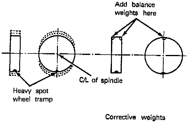 Deposits of mud, etc. must be cleaned from the inside of the rim. The tire should be inspected for the following: match mount paint marks, bent rims, bulges, irregular tire wear, proper wheel size and inflation pressure. Then balance according to the equipment manufacturer's recommendations. There are two types of wheel and tire balance:a. Static balance is the equal distribution of weight around the wheel. Assemblies that are statically unbalanced cause a bouncing action called tramp. This condition will eventually cause uneven tire wear.