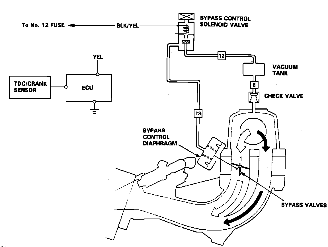 The Bypass Control Solenoid Valve, found at front of engine, next to intake manifold, determines which path incoming air will follow. Two air intake paths are provided in the intake manifold to allow the selection of the intake path most favorable for a given engine speed.