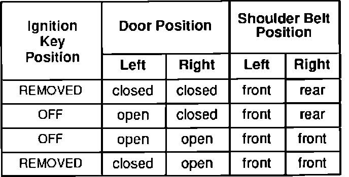 When the ignition switch is turned OFF and the key is removed, the driver's shoulder belt travels forward and remains there, regardless of the driver's door position. The passenger's belt remains in the rear position until the passenger's door is opened, at which time the belt travels forward and remains there.