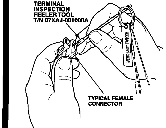 *Loose terminal fit can cause a number of intermittent problems in electrical circuits. By using the Terminal Inspection Feeler Tool Set T/N 07XAJ-OO1000A, you can inspect the terminal fit between the two matching connectors without removing the terminals from the connector body.**1. Find the terminal tool that best matches the male terminal in the mating connector.*