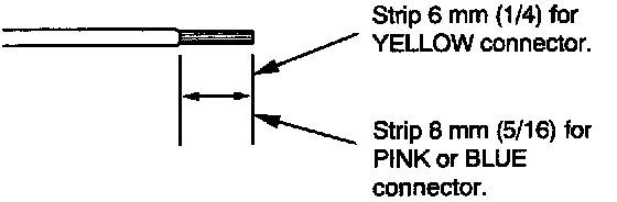 7. If you are using a yellow splice connector, strip about 6 mm (1/4 inch) of insulation off the ends of both wires. If you are using a pink or blue splice connector, strip off about 8 mm (5/16 inch) of insulation.
