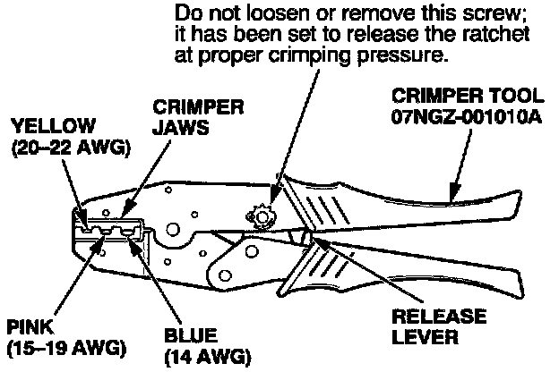 1. Remove the damaged or faulty terminal from the connector. Use the proper removal tool from Pin Tool Set T/N 07JAZ-002000A.