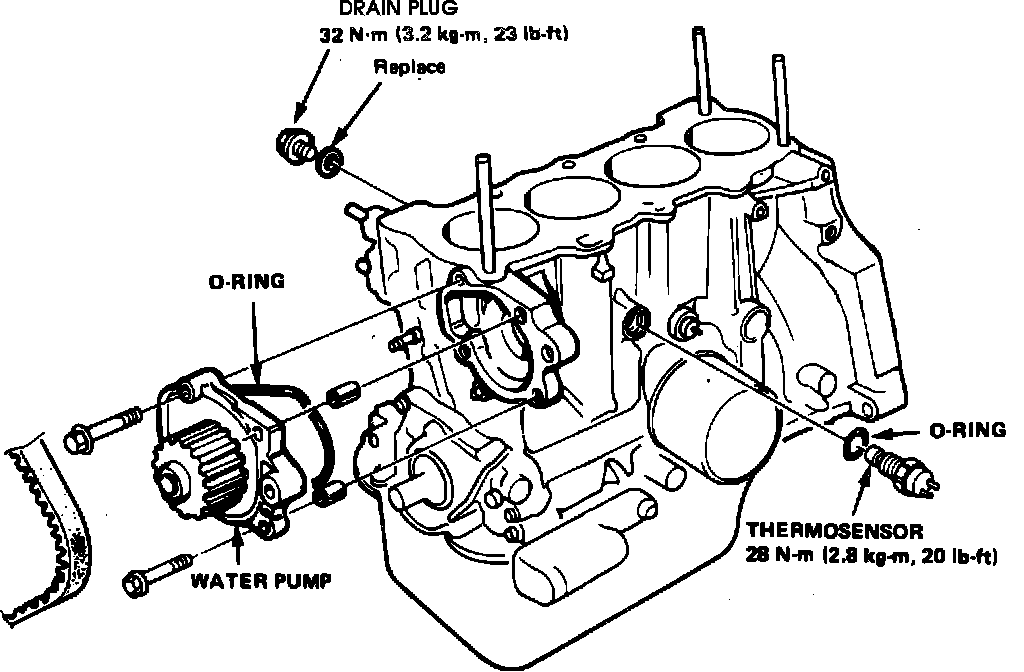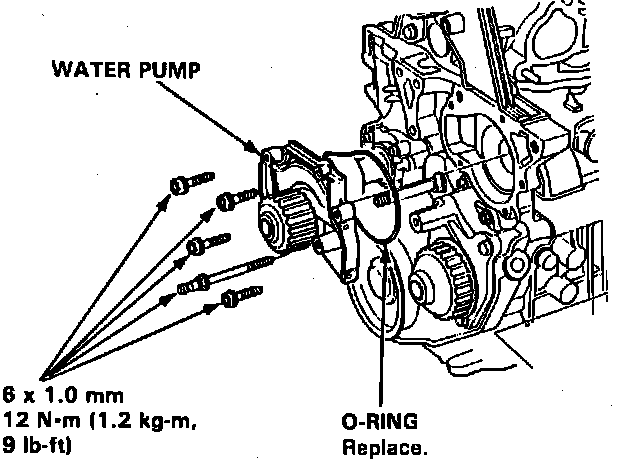4. Reverse procedure to install. Tighten water pump attaching bolts to specification