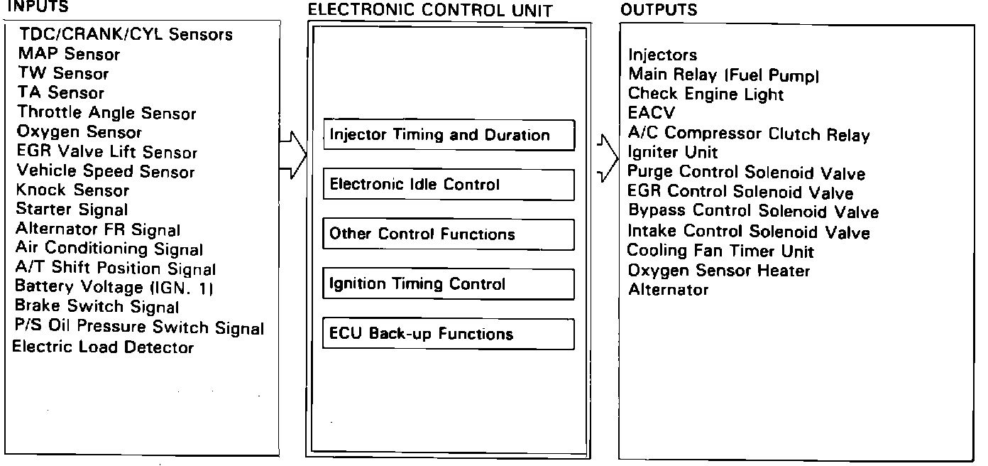 The ECU contains memories for the basic discharge timing and duration of the fuel injectors at various engine speeds and manifold pressures. The basic discharge values are then modified by signals sent from various sensors to obtain the final injection values.