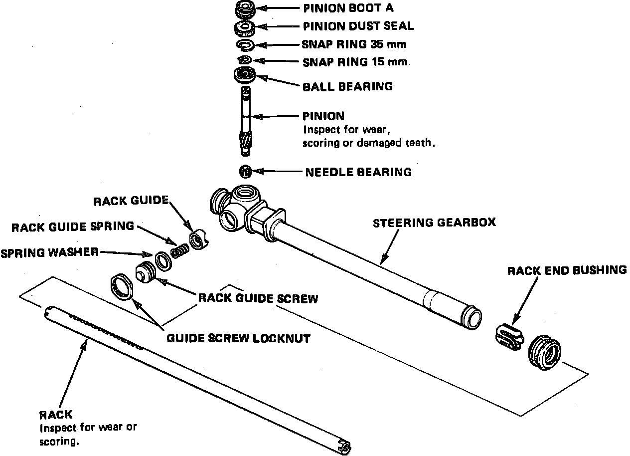3. Install rack and pinion into steering gear, then snap rings and seals.