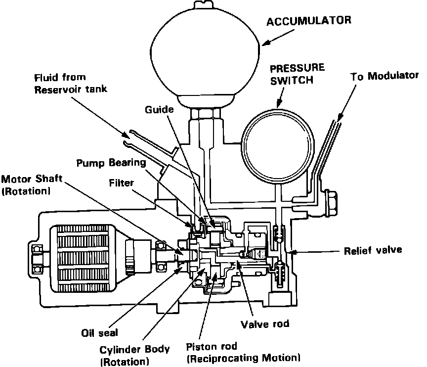The power unit consists of a motor, filter, guide, piston rod and cylinder body. Since a guide is positioned offset to the center of the motor shaft, the rotation of the motor and cylinder body provides the reciprocating motion to the piston rod. The brake fluid is thus pressurized and fed to the relief valve, accumulator and modulator.