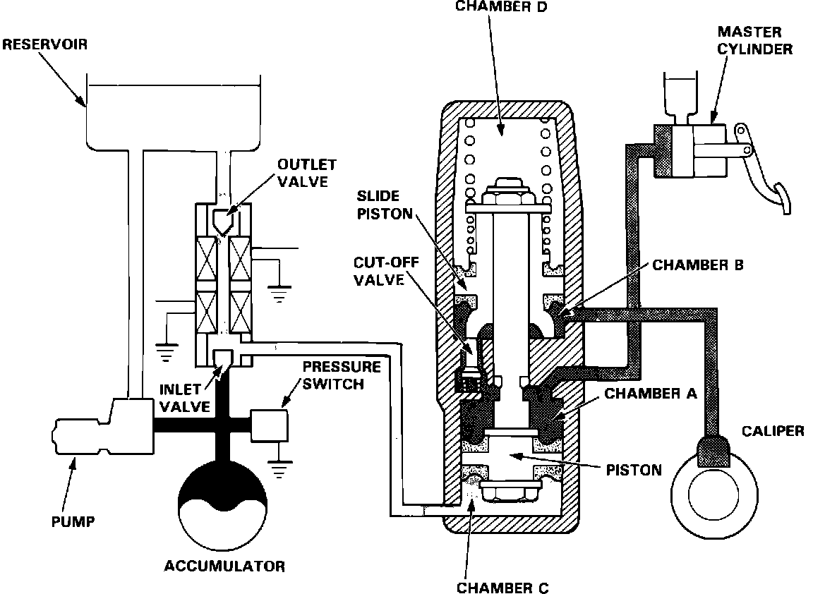 Chamber C is connected to the reservoir through the outlet valve, which is normally open. It is also connected to the hydraulic pressure source (pump, accumulator, pressure switch, etc.) via the inlet valve, which is normally closed. Chamber 0 serves as an air chamber. Under these conditions, the pressures of chambers C and D are maintained at about atmospheric pressure, permitting regular braking operations.