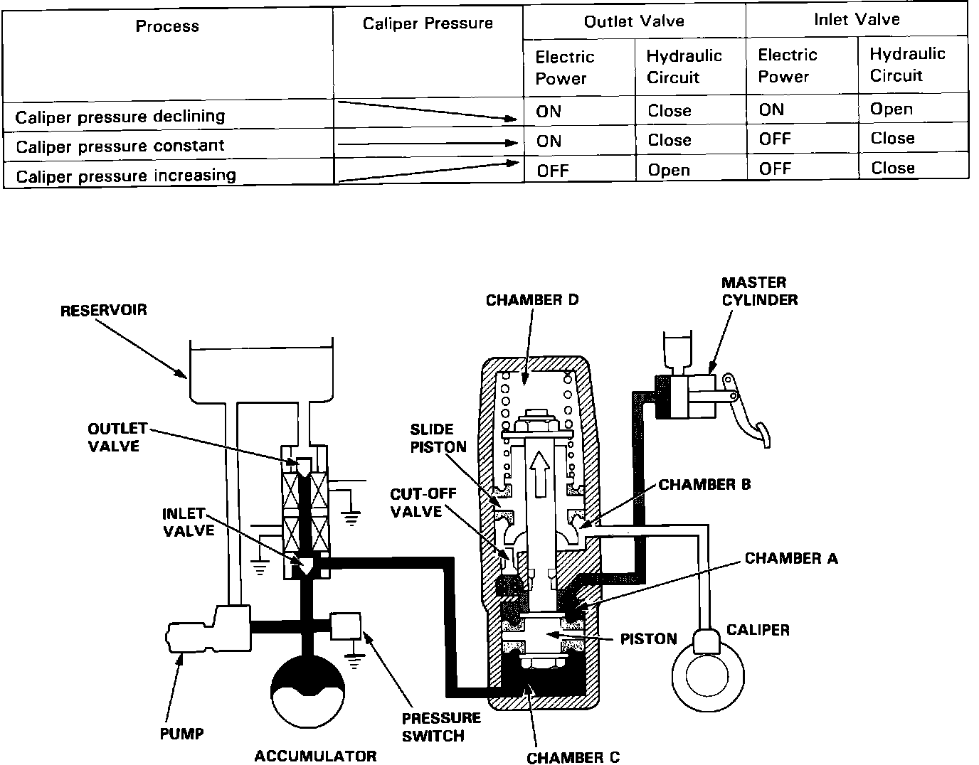When the anti-lock brake system is functioning, the piston moves upward, the volume of chamber B increases, and the fluid pressure on the caliper side is reduced. At the same time, the volume of chamber A is reduced and the brake fluid is returned to the master cylinder. When the brake fluid is pushed back to the master cylinder, the driver can feel the functioning of the anti-lock brake system because the brake pedal is kicked back.