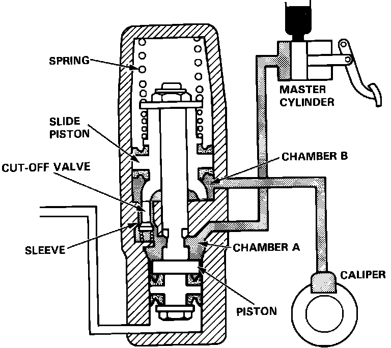 ^ Chamber A and chamber B are therefore connected through the gap. The pressure from the master cylinder flows into the rear calipers through chamber A and chamber B.