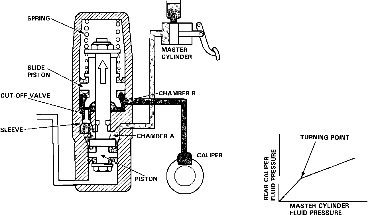 As the fluid pressure from the master cylinder further increases, the pressure in chamber A becomes higher, causing a force to push down the large diameter portion of the piston. Consequently, the slide piston comes down, the cutoff valve is pushed downward by the bottom of the slide piston, allowing chambers A and B to connect momentarily. As this occurs, pressure in chamber B increases, the slide piston is pushed upward, the cut-off valve goes up, and the connection between chamber A and chamber B is blocked again. As described above, when the pressure in the master cylinder is above the turning point, the slide piston reduces the pressure in the rear caliper to the prescribed pressure by repeating these processes.