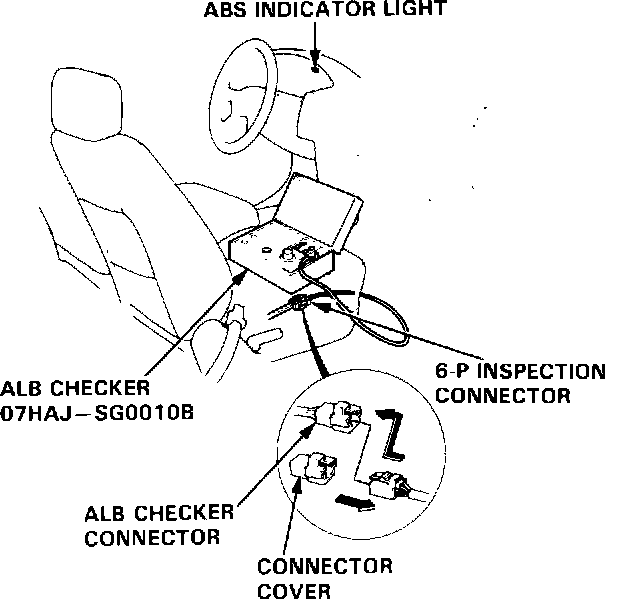 1. With the ignition switch off, disconnect the 6-P inspection connector from the connector cover located on the cross-member under the passenger's seat and connect the 6-P inspection connector to the ALB checker.