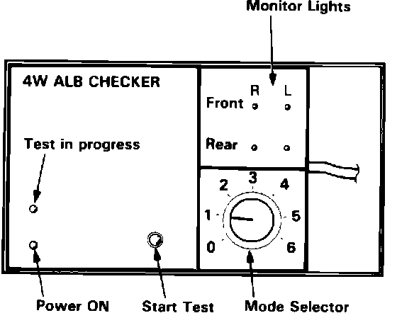 NOTE:^ The ALB checker is designed to confirm proper operation of the anti-lock brake system (ABS) by simulating each system function and operating condition. Before using the checker, confirm that the anti-lock brake system (ABS) indicator light is not indicating some other problem with the system. The light should go on when the ignition is first turned on and then go off and stay off one second after the engine is started.