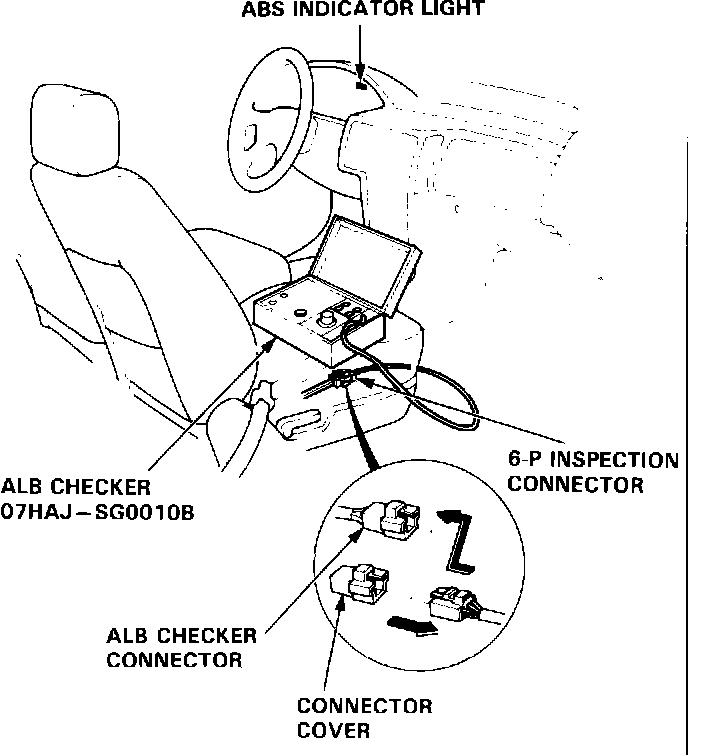 1. Disconnect the 6-P inspection connector from the connector cover located on the cross-member under the passenger's seat and connect the 6-P inspection connector to the ALB checker.