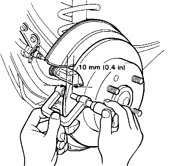 11. Using a micrometer, measure the rear brake disc thickness at eight points, approximately 45° apart and 10 mm (0.4 in) in from the outer edge of the disc.