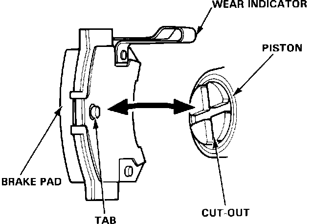 18. Rotate the caliper piston clockwise into place in the cylinder, then align the cut-out in the piston with tab on the inner pad. Install the pad with the wear indicator on the inside.