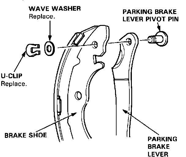 7. Remove the wave washer, parking brake lever and pivot pin from the brake shoe by removing the U-clip.