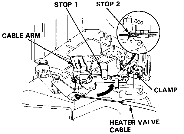 3. Turn the cable arm to stop 1 and connect the end of the heater valve cable to the cable arm.