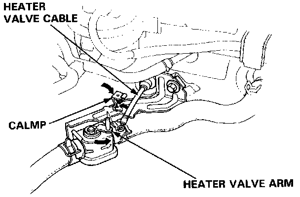 5. Under the hood. Turn the heater valve arm to SHUT and connect the end of the heater valve cable to the heater valve arm.