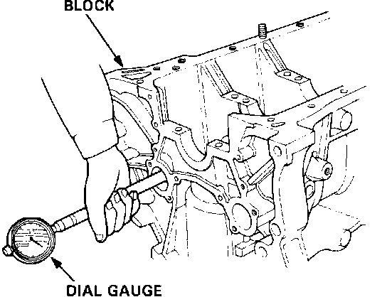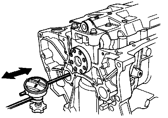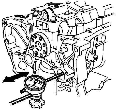 1. Push the balancer shaft firmly away from the dial indicator, and zero the dial against the front end of the balancer shaft, then pull the balancer shaft firmly back toward the indicator.