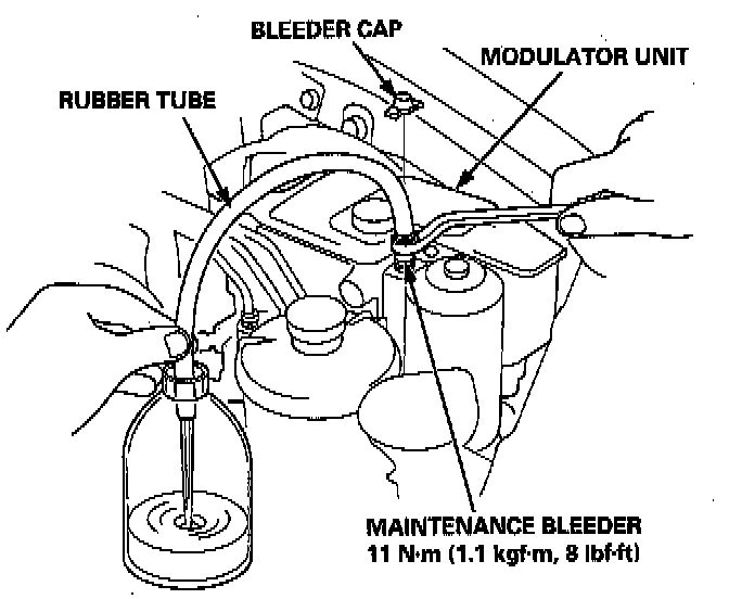 CAUTION: Do not loosen the relief plug on the accumulator.NOTE: Brake fluid replacement procedure explained in this article is for the brake fluid in the modulator unit (that is, the brake fluid in the high-pressure passage and in the reservoir). Fluid replacement procedures for the rest of the brake system are incorporated into the brake bleeding procedures for the basic brake hydraulic system. System Bleeding