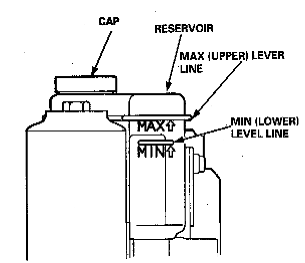 E) Check the brake fluid level in the reservoir. It should be below the MAX (upper) level line.