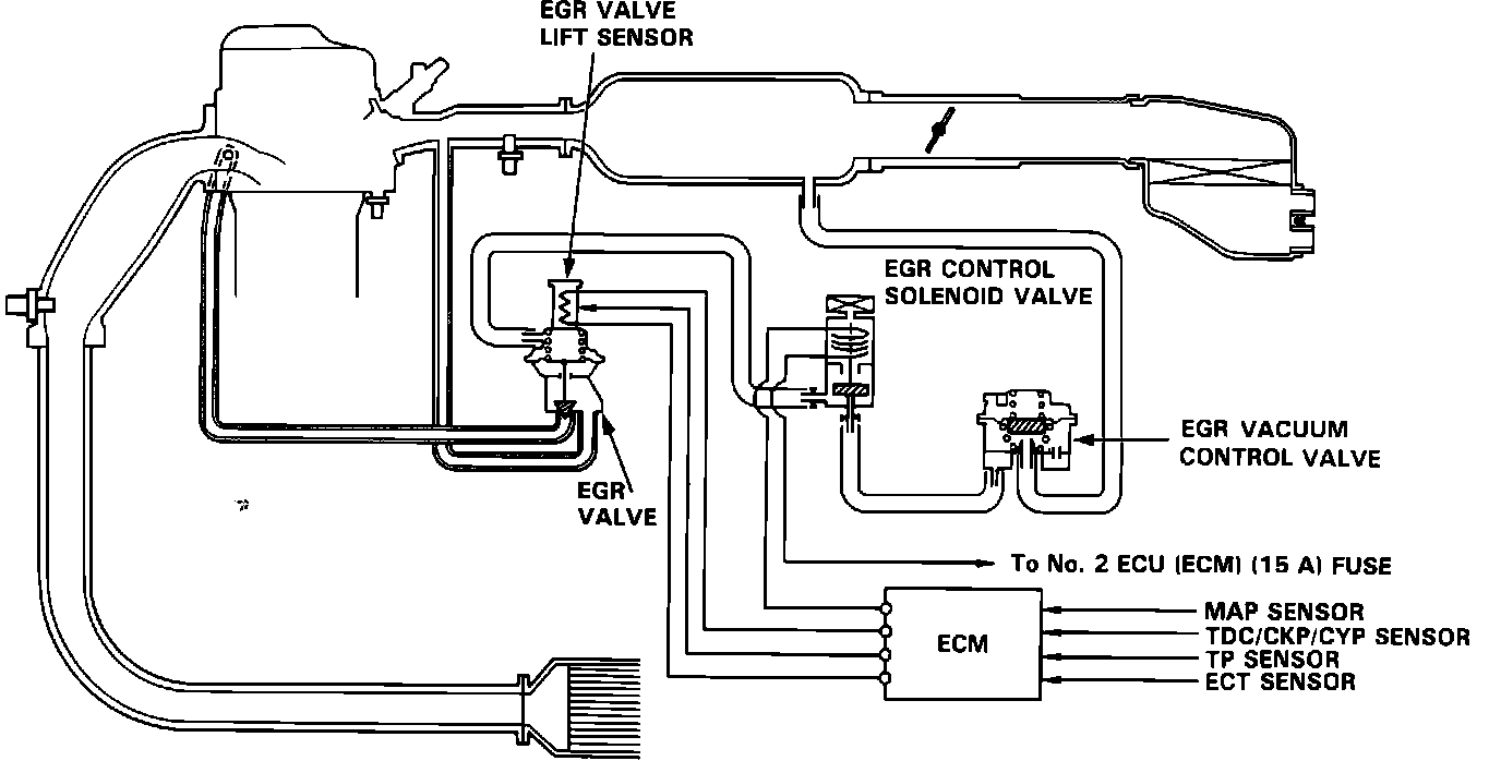The EGR system is also equipped with a lift-sensor. It sends a signal to the ECM of how far the EGR valve is open. With information from the lift-sensor, the PGM-FI ECM controls the amount of exhaust gas entering the combustion chamber, by varying the voltage to the EGR Control Solenoid valve.
