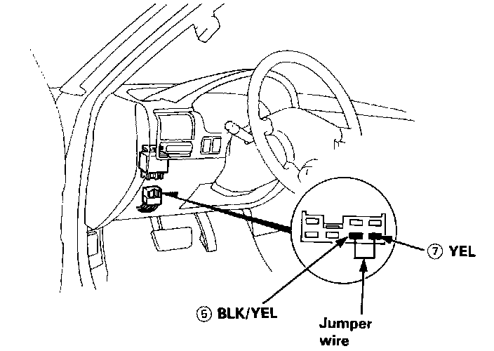 4. Disconnect the main relay connector and connect the BLK/YEL (#5) wire and YEL (#7) wire with a jumper wire.