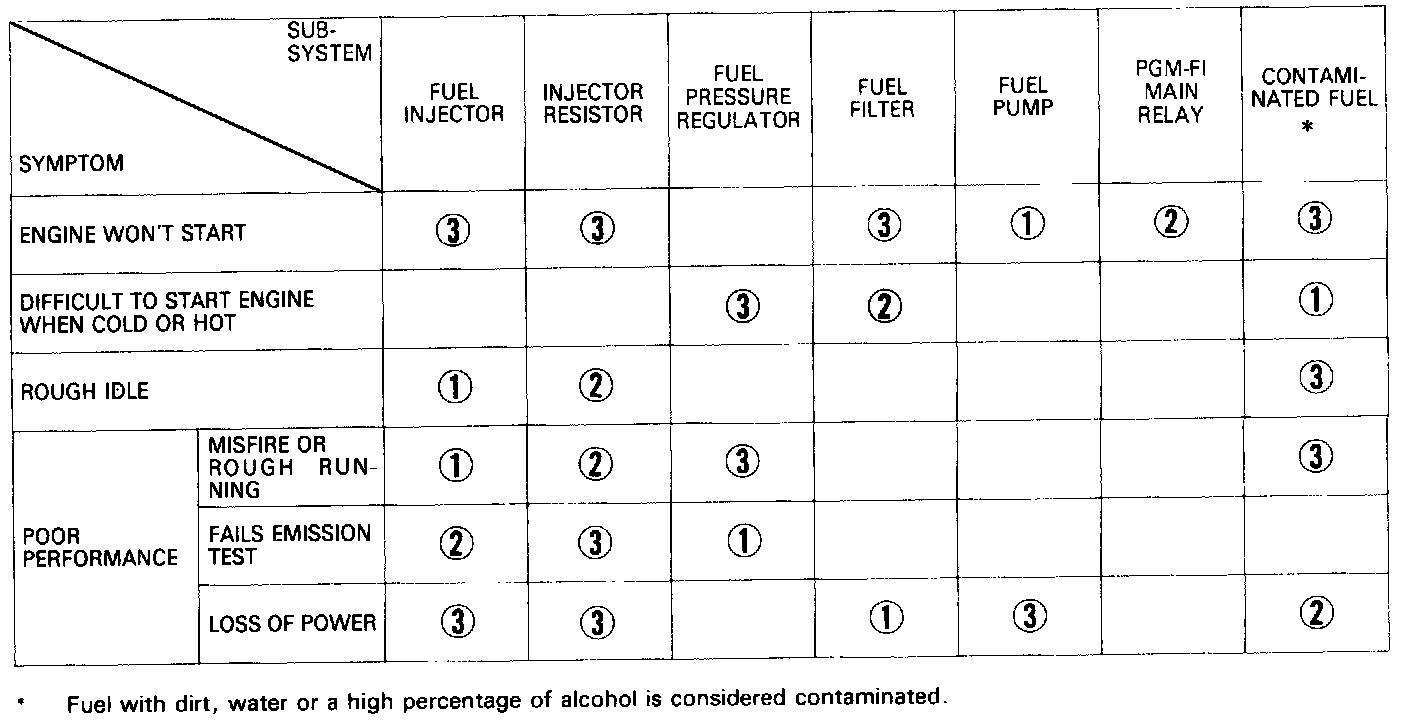 NOTE: Across each row in the chart, the sub-systems that could be sources of a symptom are ranked in the order they should be inspected starting with 1. Find the symptom in the left column and read across to the most likely source. If inspection shows the system is OK, try the next most likely system 2, etc.