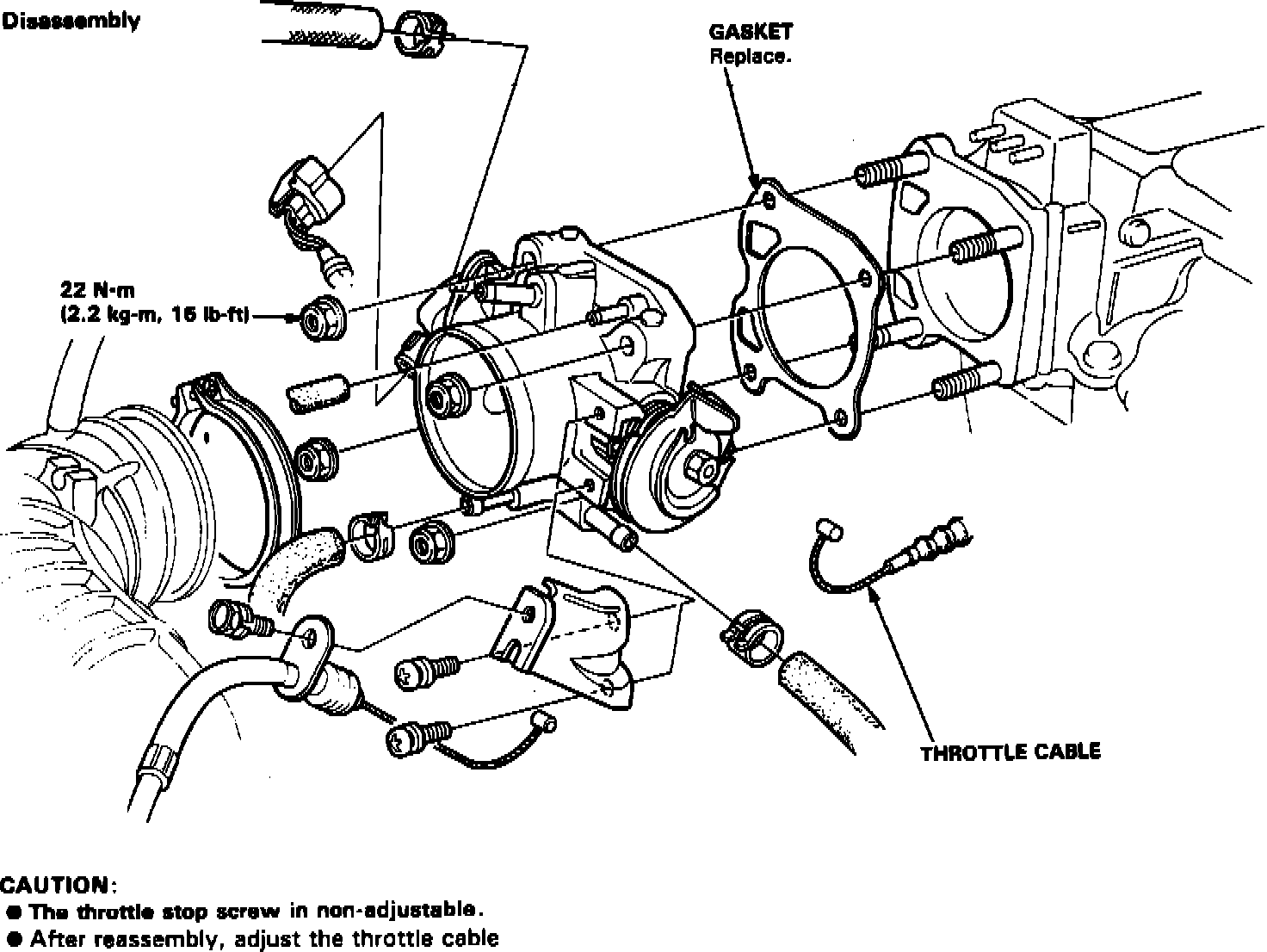7. After reassembly, adjust the throttle cable and, on A/T equipped cars, the A/T throttle control cable.