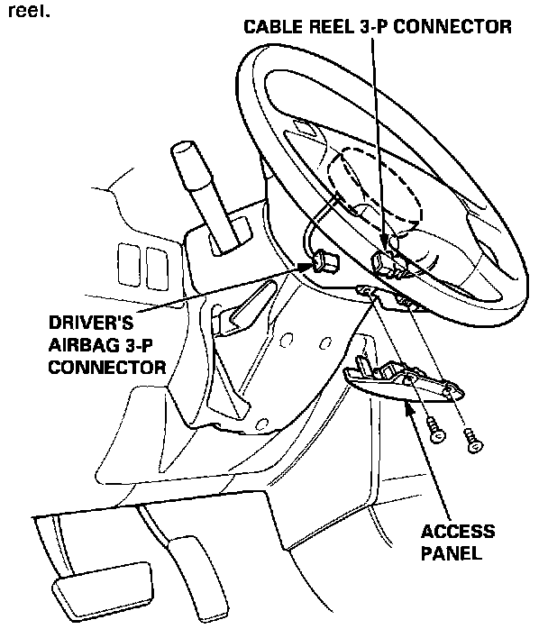 3. Remove the access panel, then disconnect the 3-P connector between the driver's airbag and the cable reel.