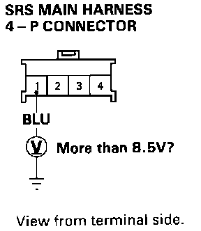 2. Turn the ignition switch ON and wait for six seconds. Measure the voltage between the No.1 terminal and body ground on the SRS main harness 4-P connector side, with the ignition switch ON.