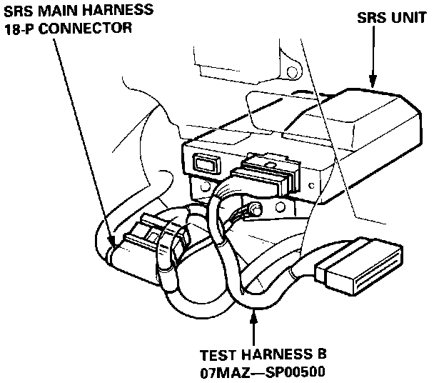 4. Connect Test Harness B (O7MAZ SPOO5OO) between the SRS unit and the SRS main harness 18-P connector.