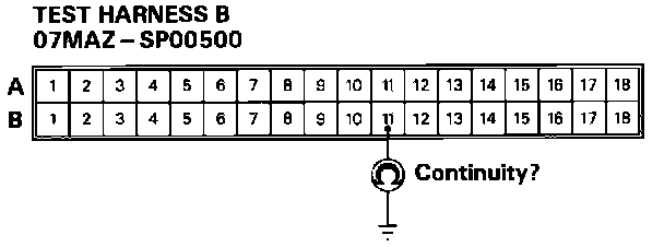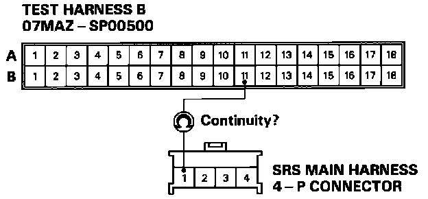 7. Check for continuity between the B11 terminal of Test Harness B (07MAZ SPOO5OO) and the No.1 terminal of the SRS main harness 4-P connector.