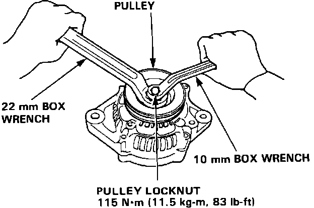 To remove the pulley, loosen the locknut with 10 mm and 22 mm wrenches. If necessary, use an impact wrench