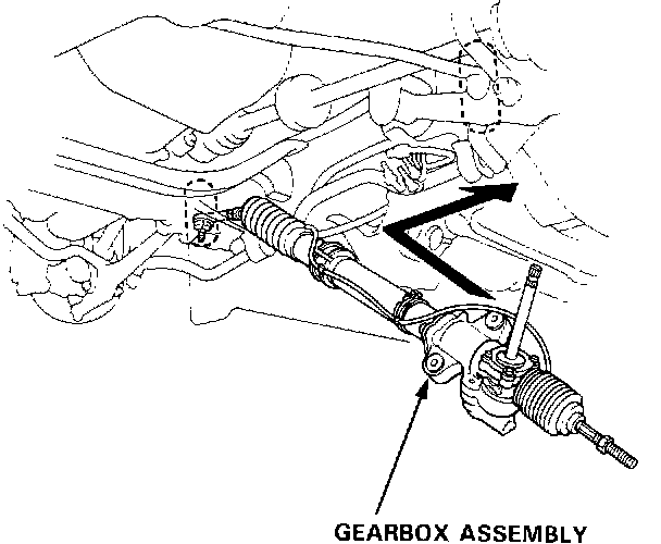 1. Slide the rack all the way to the right.2. Pass the right side of the steering gearbox assembly above and through the right side of the rear beam.