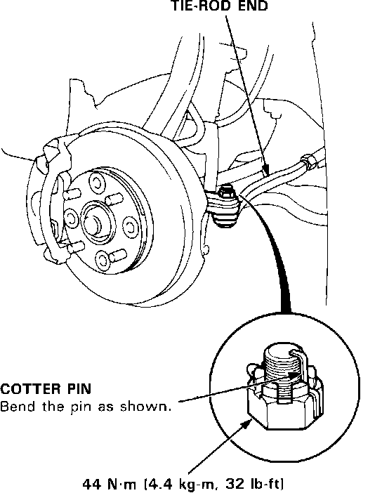 10. Reconnect the tie-rod ends to the steering knuckles, tighten the castle nut to the specified torque, and install new cotter pins.