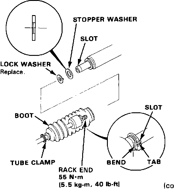 44. Tighten the rack end securely, then bend the lock washer back against the flat on the flange as shown.