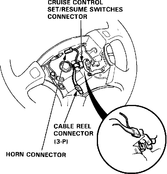 3. Insert the cruise control set/resume connector and cable reel connector (3-P) to the steering wheel clips.