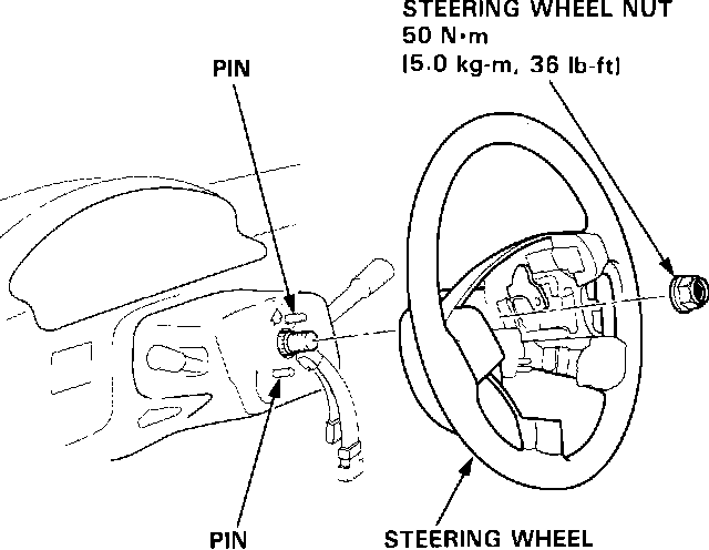 NOTE: Be sure the steering wheel shaft engages the pins of the cable reel.