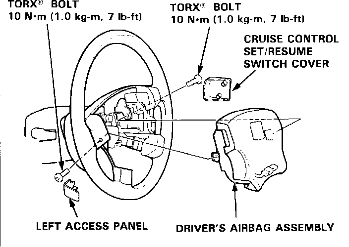 5. Install the driver's airbag assembly with new TORX'bolts.