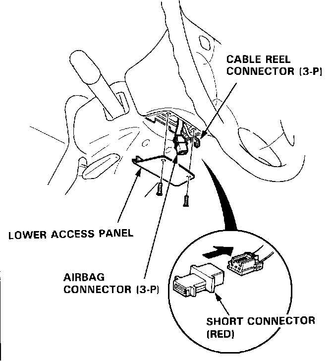 2. Remove the lower access panel from the steering wheel lower cover, then remove the short connector (red).
