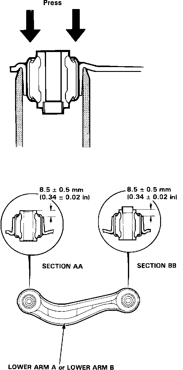NOTE: Install the bushings so that 8.5 +/- 0.5 mm (0.34 +/- 0.02 in) protrudes from the lower arm A as shown.