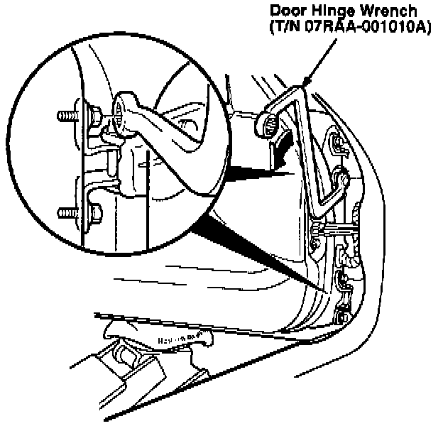 2. To adjust the door in or out, use the Door Hinge Wrench (T/N 07RAA-001010A) to loosen the hinge bolts on the door side. To keep the door from getting far out of adjustment, loosen the bolts only slightly. Support the door with a jack.