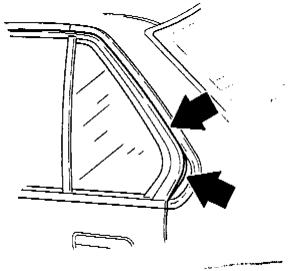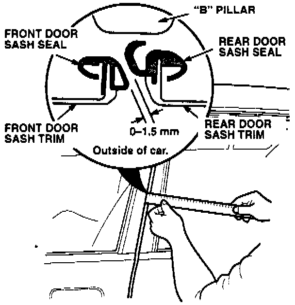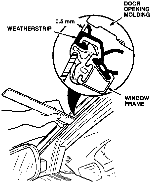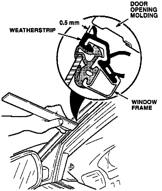 1. Inspect the weatherstrip fit along the top of the front door and along the A pillar. It should fit under the molding no more than 0.5 mm from the outside edge. If it is more than 0.5 mm, adjust the window frame outward.