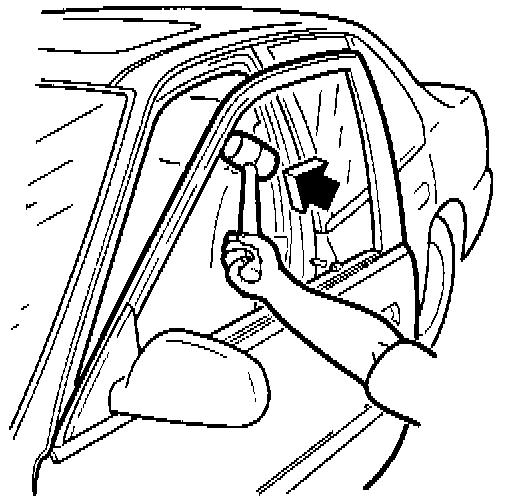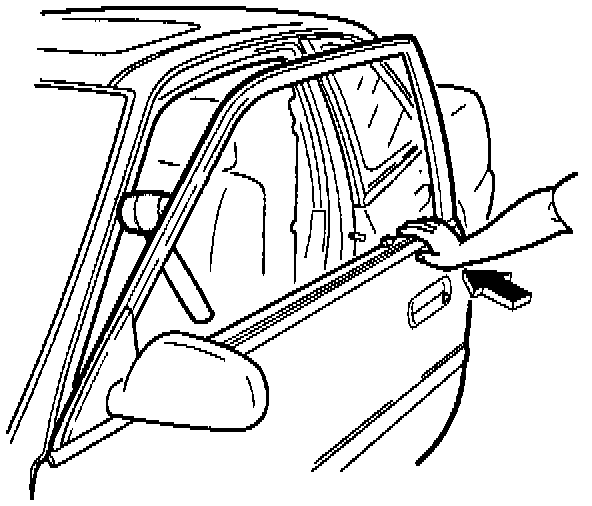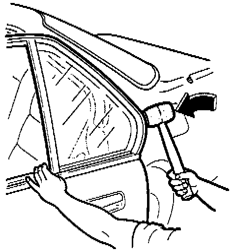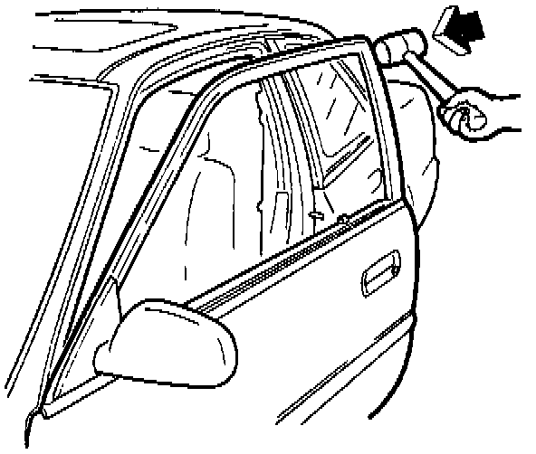 2. To adjust the window frame, lower the window. Place a mallet head or block of wood between the window frame and the body at the A pillar. Close the door against the mallet or block and carefully push on the door to force the window frame outward.