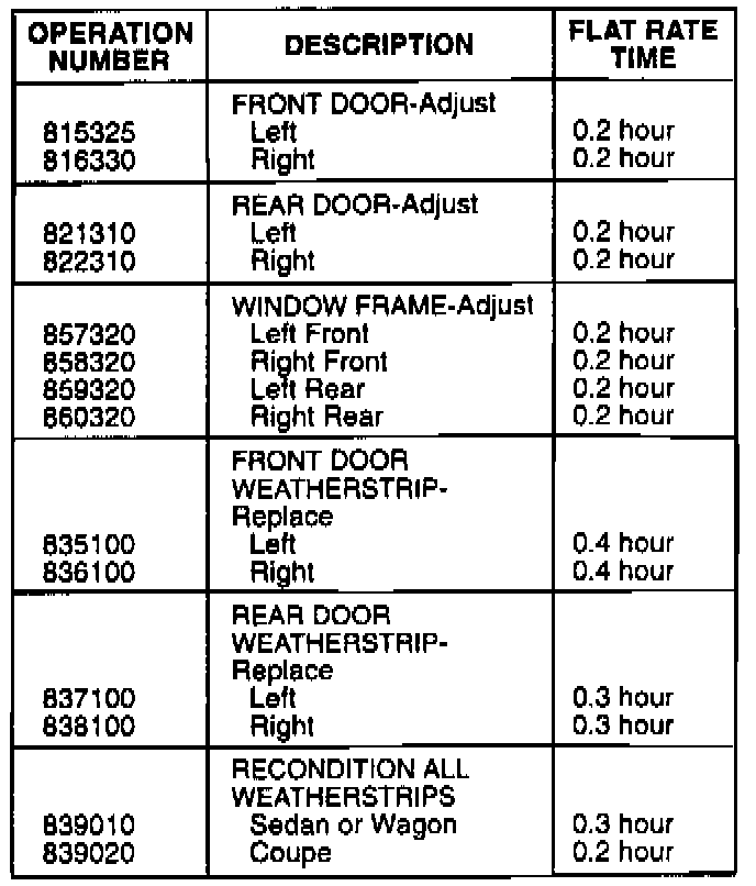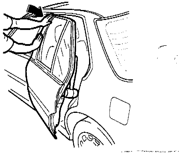 8. The rear door sash should also be recessed slightly behind the front door sash. If the rear door seal overlaps the front door seal, or the rear door sash is not recessed, bend in the top of the rear window frame. Place a rubber mallet between the rear door and the body. Close the door against the mallet; then push on the top front corner of the rear door window frame to bend it in.