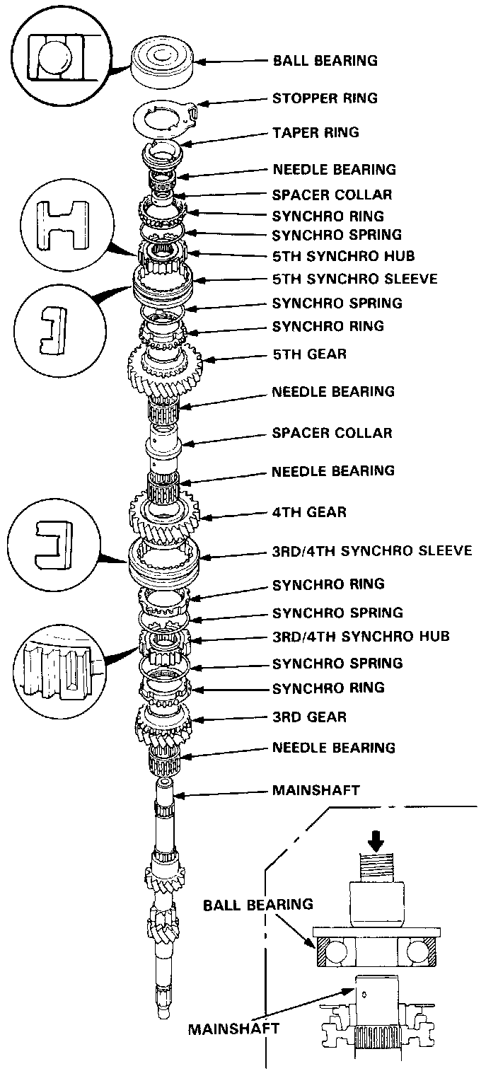 Prior to reassembling, clean all the parts in solvent, dry them and apply lubricant to any contact surfaces.1. Assemble the mainshaft as shown below.