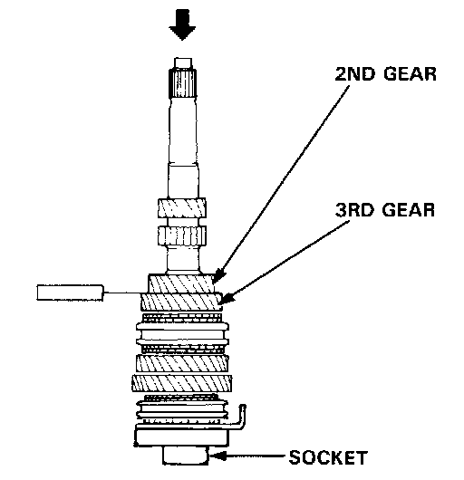 2. Measure the clearance: support the bearing race with a socket, push down on the shaft and measure the clearance between 3rd and 2nd gears.